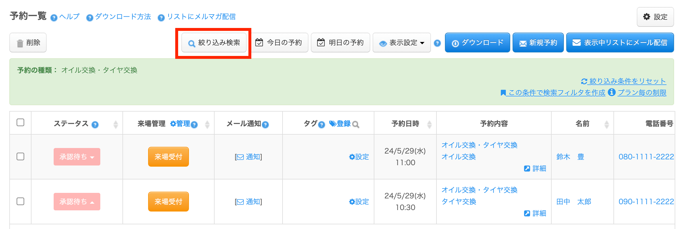 この機能を使って、「予約日時」、「受付日時」、「ステータス(承認待ち、キャンセル待ちなど)」などの情報を基に予約データを絞り込むことができます。さらに、絞り込んだ予約情報をCSVファイルとしてダウンロードすることも可能です。
