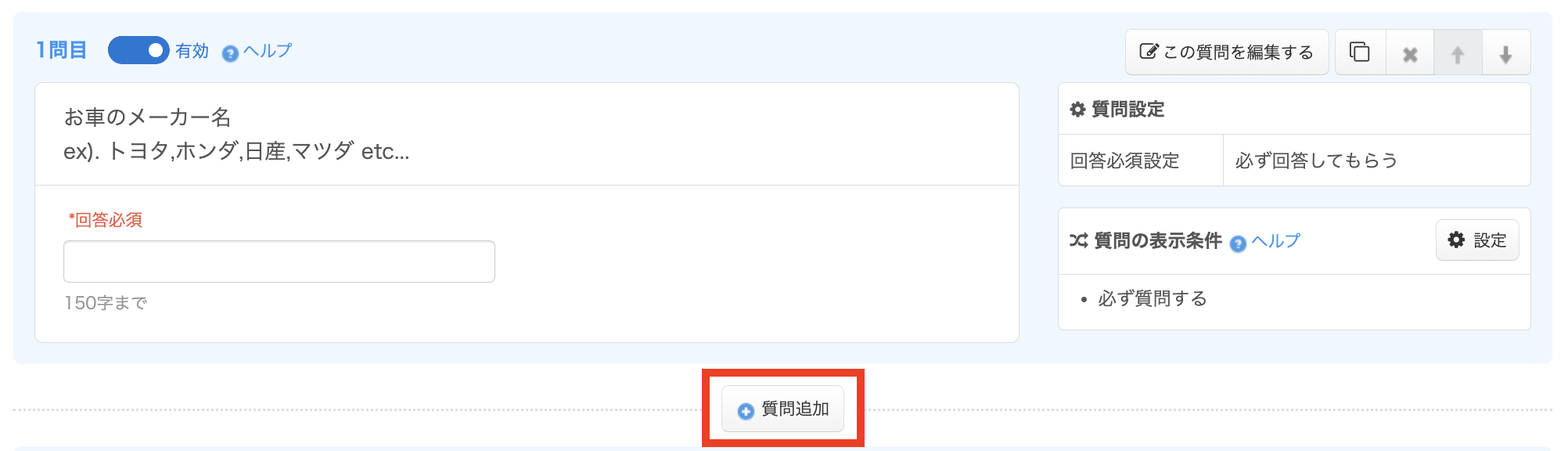 質問を追加したい場合は、「質問追加」をクリックすると設定画面が表示されます。