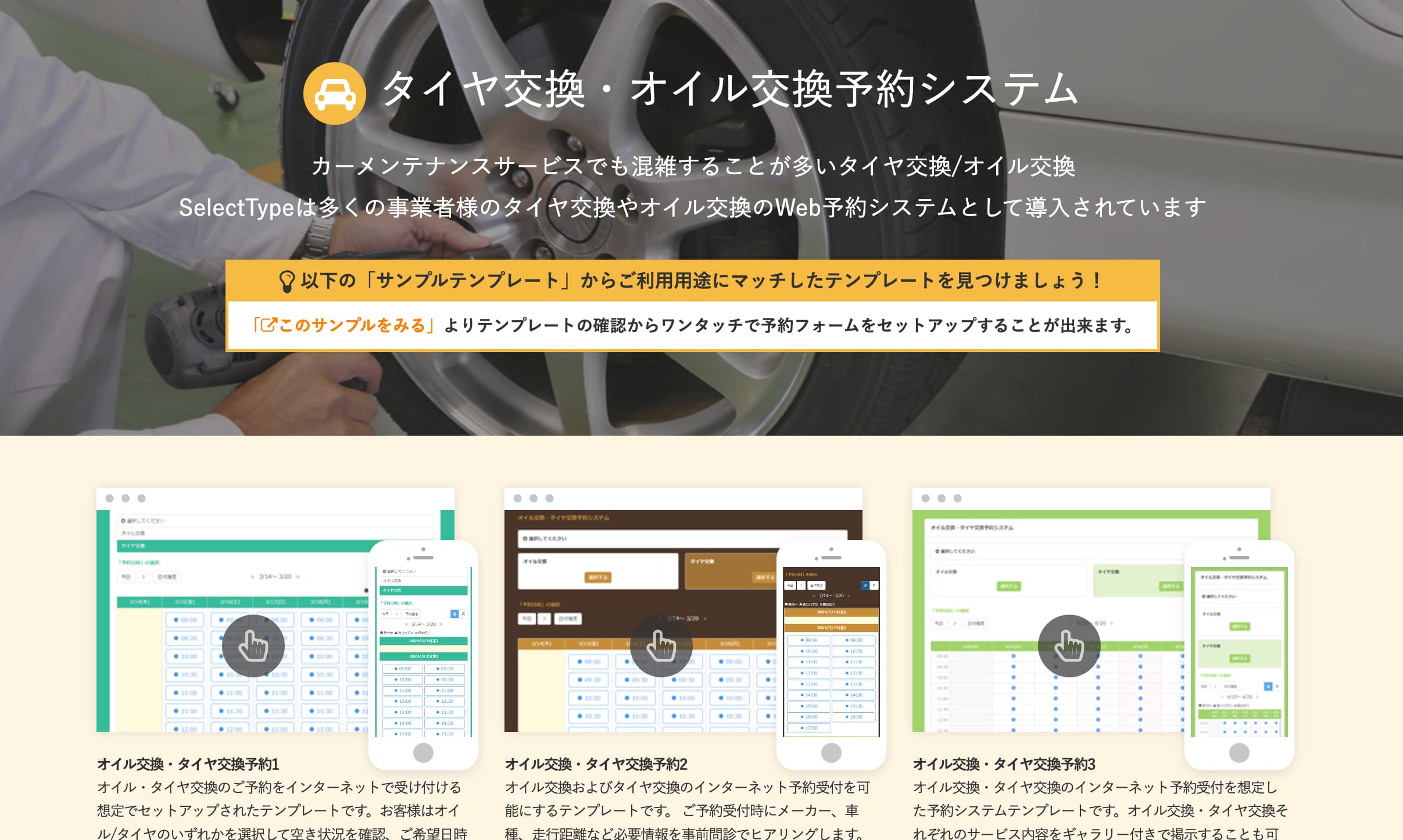 タイヤ交換・オイル交換の予約システムのテンプレートを紹介しているページです。