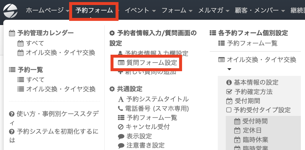 質問を設置する際は、ヘッダーの「予約フォーム」をクリックし「質問フォーム設定」を選択します。