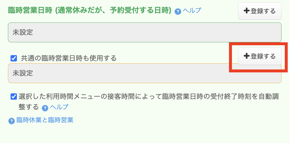 臨時営業日時欄の「登録する」をクリックすると設定画面が表示されます。