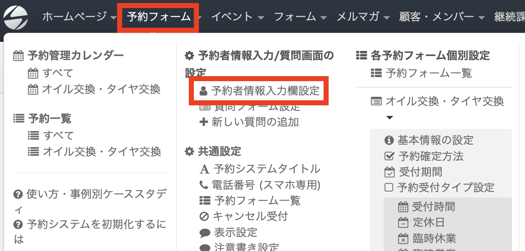 予約者情報入力欄を変更する場合は、ヘッダーの「予約フォーム」をクリックし「予約者情報入力欄設定」をクリックします。