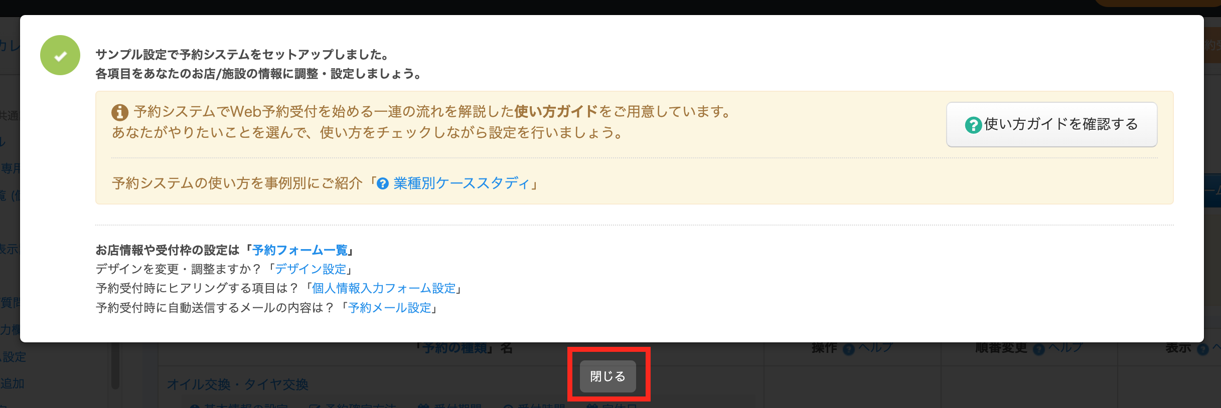 予約システムのセットアップが完了した旨のメッセージが表示されます。「閉じる」をクリックします。