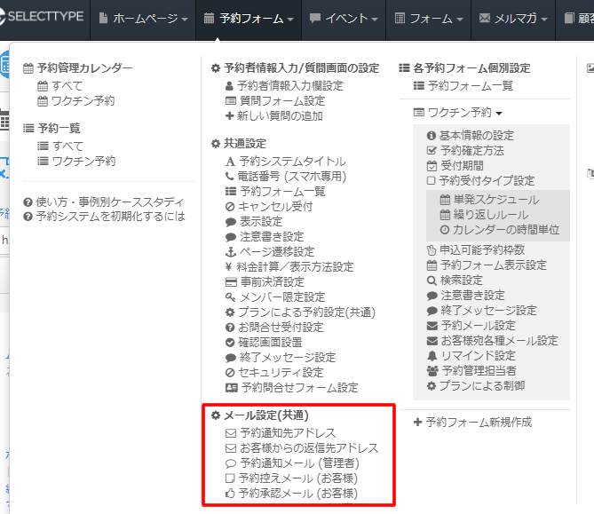SELECTTYPEから予約に関するメールの設定は「メール設定(共通)」にて各種設定が行えます。