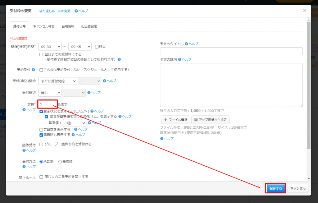 受付枠の変更が表示されますので、定員数を変更して「保存する」をクリックします。