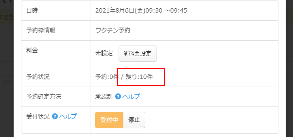 ここで設定した定員数の予約が入ると締め切り状態となり、自動で受付停止されます。