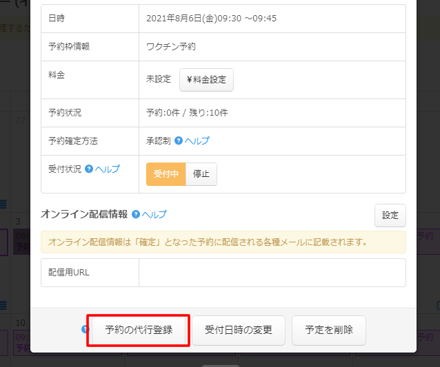 「予約の代行登録」ボタンをクリックします。