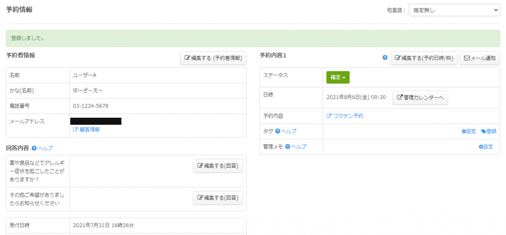 予約者情報詳細画面が表示されますので、登録された情報が反映されているか確認しましょう。