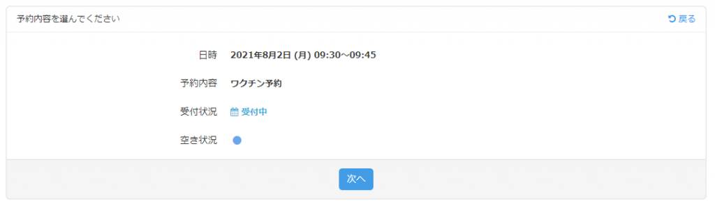 日付を選択すると確認画面が表示され、次へをクリックします。