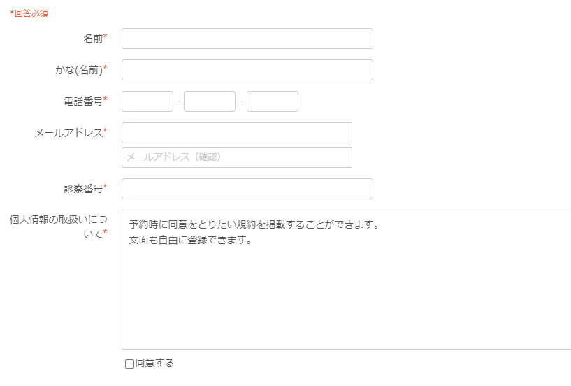 項目名を「診察券番号」とすると予約者情報入力フォームに診察券番号の入力欄を設置する事ができます。