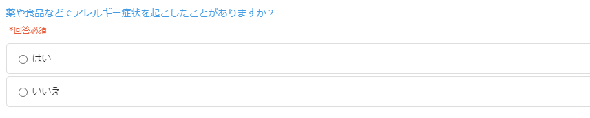 質問文に「薬や食品などでアレルギー症状を起こしたことがありますか?」などヒアリングしたい内容を登録します。