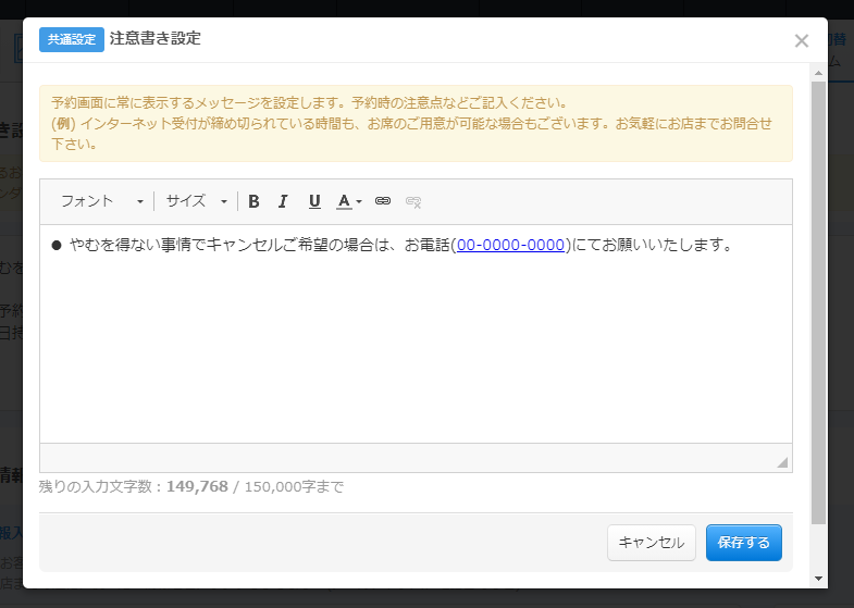 注意書きの設定は、作成した予約フォーム全てに同じ内容を記載する事もできますし、