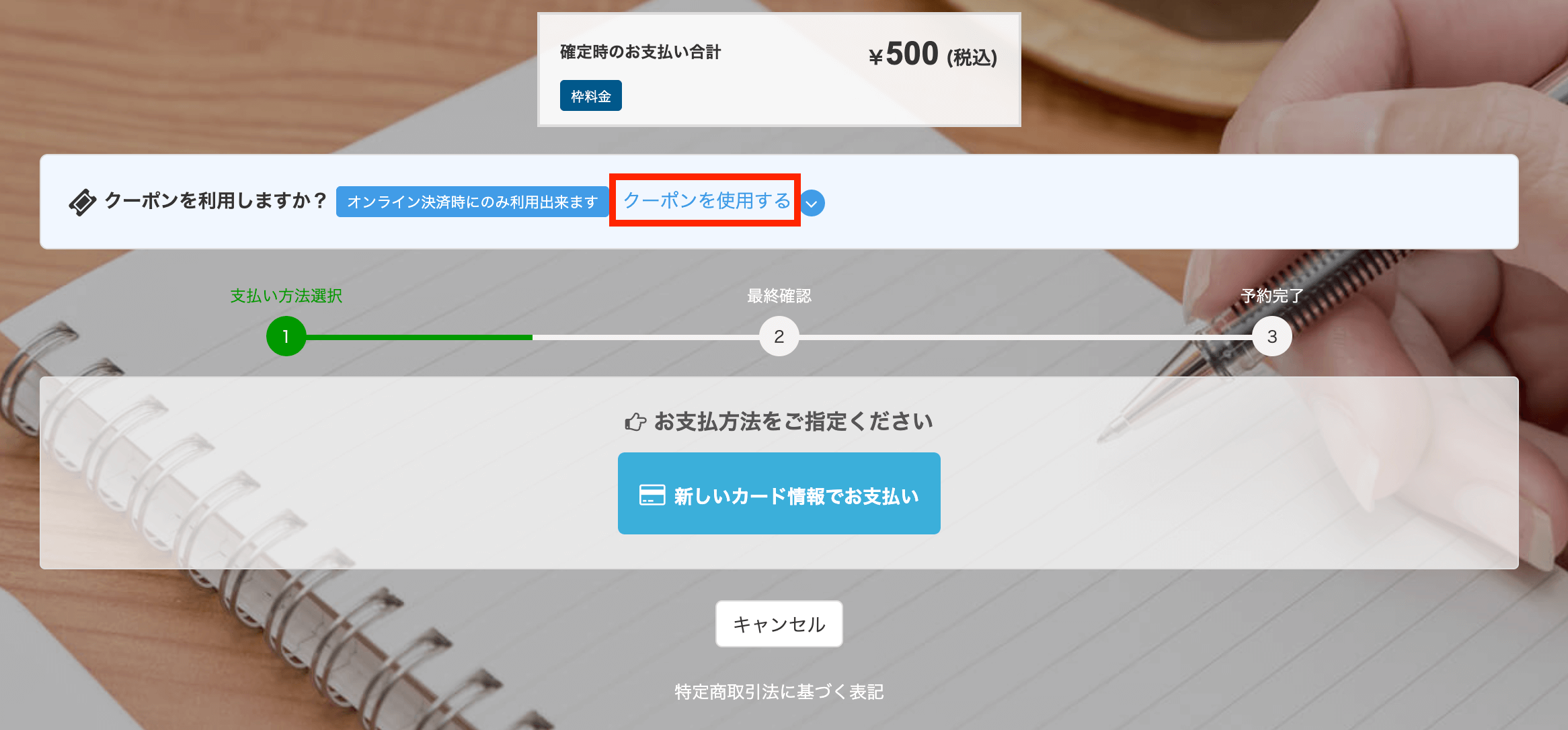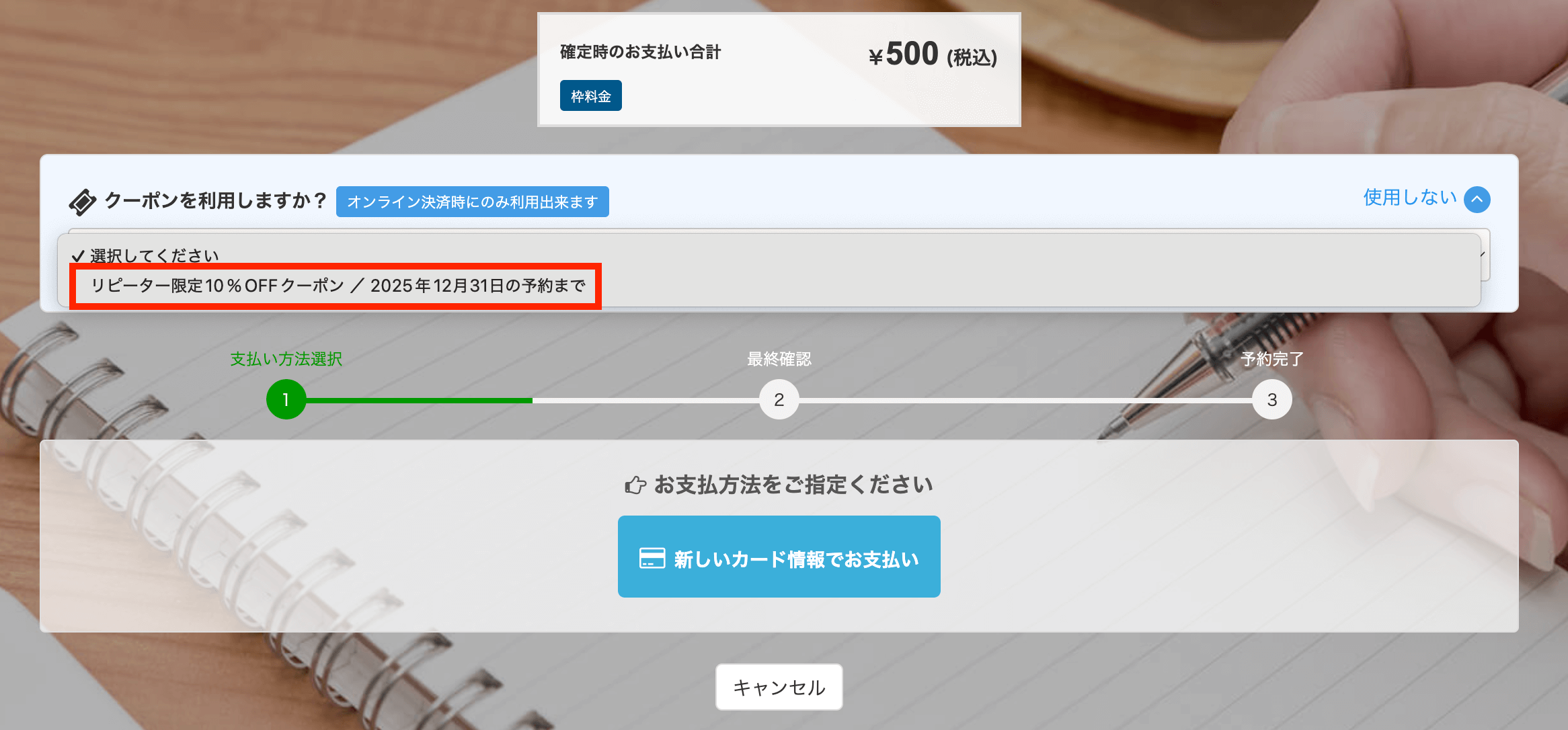 予約フォームにクーポンを設定すると、決済画面で「クーポンを利用しますか?」というメッセージが表示されます。