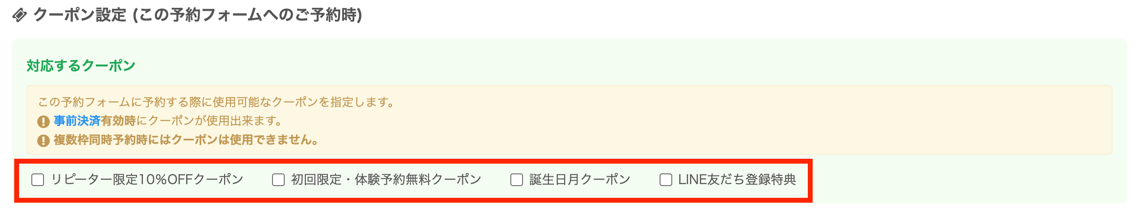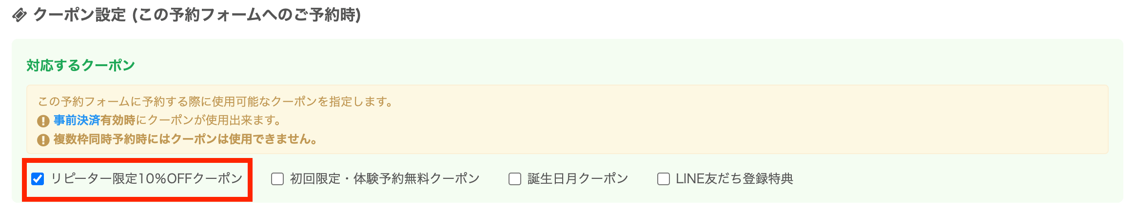 ただし、発行したクーポンを実際に使えるようにするには、予約フォームへの設定が必要です。