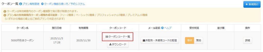ダウンロードしたいクーポン種別の「クーポンコード一覧」をクリックします。