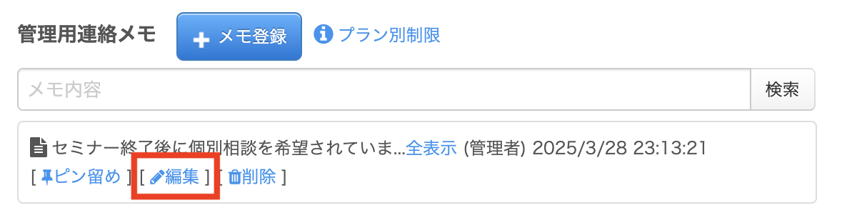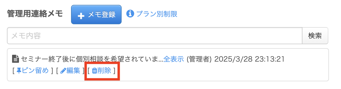 他の担当者や管理者が登録したメモについては、編集・削除はできません。修正が必要な場合は、管理者に依頼してください。
