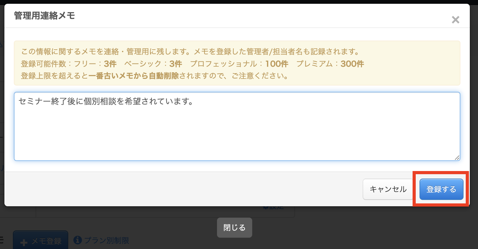 イベント申込の管理用連絡メモの登録可能数は、フォームの契約プランに準じて制限されます。