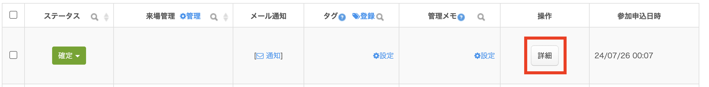 管理用メモを登録する申込の「詳細」をクリックします。