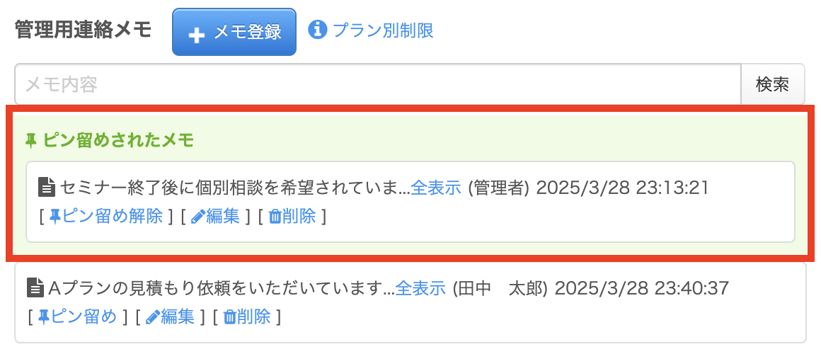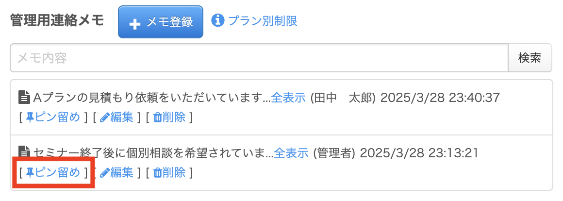 メモは「登録・編集・削除・ピン留め・検索」といった機能が揃っており、申込ごとの対応履歴を効率よく管理できます。