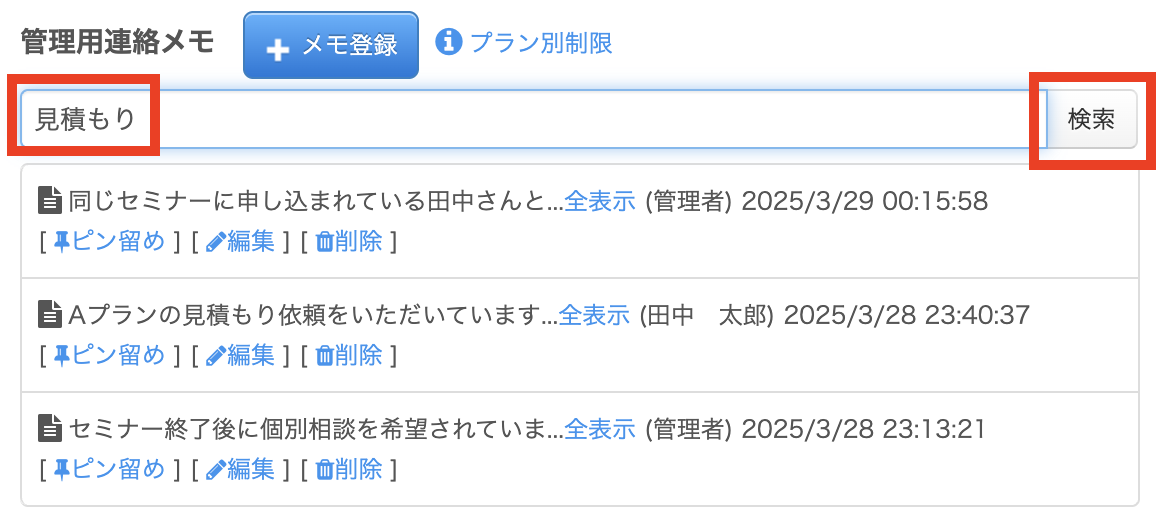 管理用連絡メモはキーワードで検索して絞り込むことができます。検索欄にキーワードを入力し、「検索」ボタンをクリックしてください。