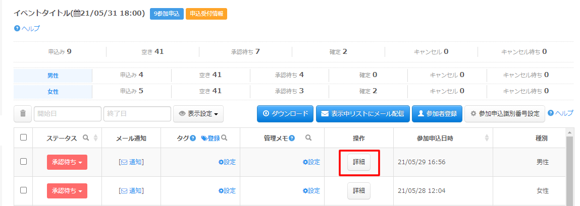 ログインしたらページ上部ヘッダーより「イベント」→「参加申込者リスト/該当イベントタイトル」をクリックします。