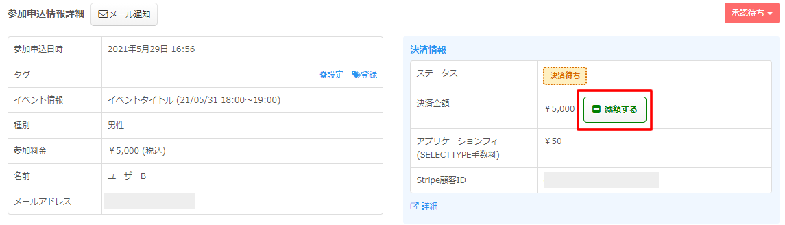 SELECTTYPEのイベント管理システムでは、決済設定された承認待ちの請求情報を減額・取り消すことが可能です。
