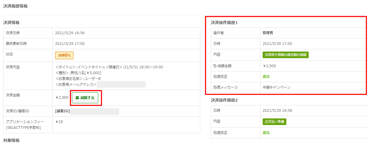 このようにSELECTTYPEのイベント管理システムでは、決済待ちの請求情報を減額したり、取り消すことができます。