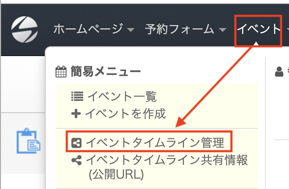 イベントタイムラインを表示するには、「イベント」 →「 簡易メニュー」 →「 イベントタイムライン管理」をクリックします。