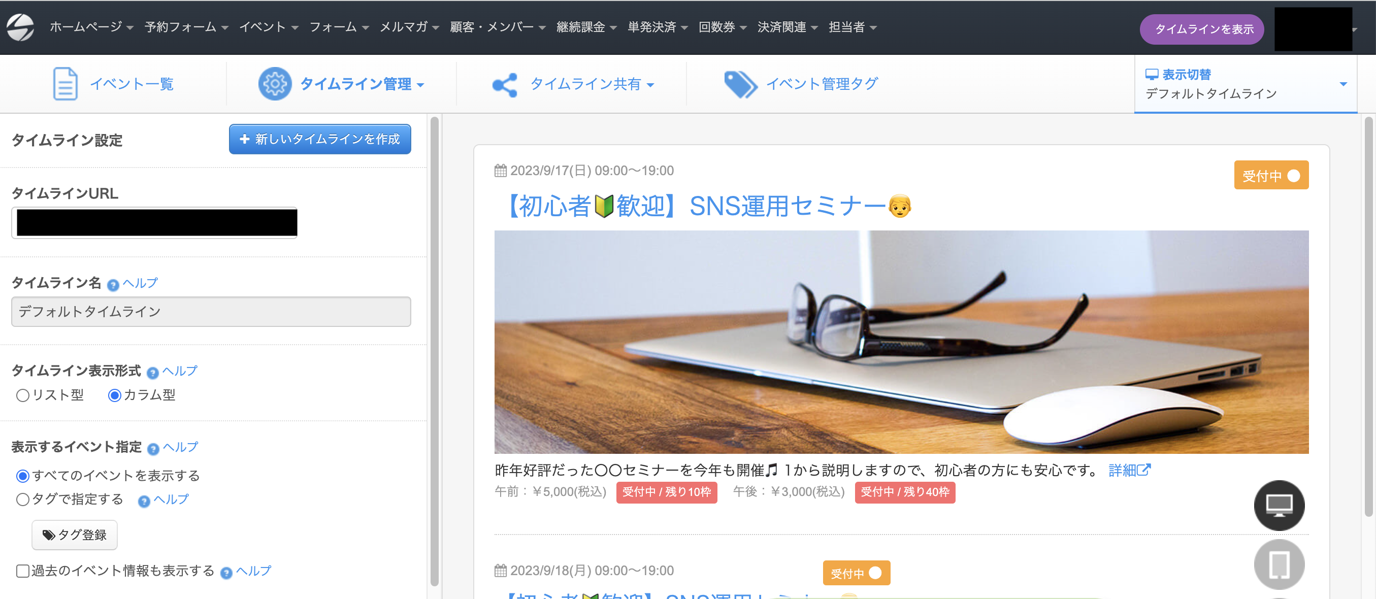 イベントタイムラインとは、複数作成いただいたイベントを開催日順に表示できる機能です。