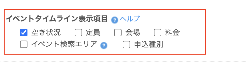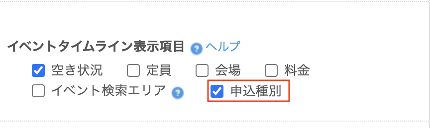 今回は、イベント作成時に設定した申込種別をタイムラインに表示させるため、「申込種別」にチェックを入れます。