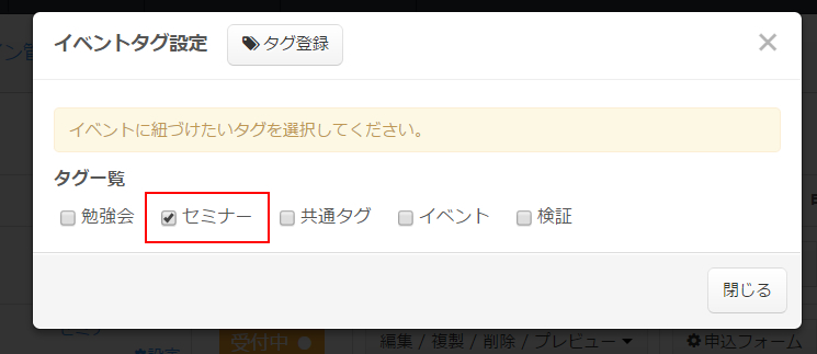 このようにSELECTTYPEのイベント管理・セミナー管理システムでは「タグ機能」を使って、作成したイベント・セミナー告知ページのタグ付けが可能です。
