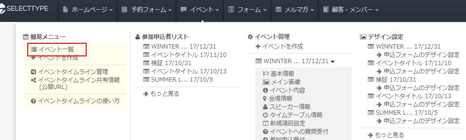 ログインしたらヘッダーメニューより「イベント」→「イベント一覧」をクリックします。