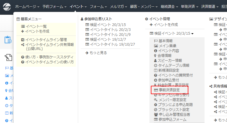 ログインしたらページ上部ヘッダーより「イベント」→「イベント管理/事前決済設定」をクリックします。