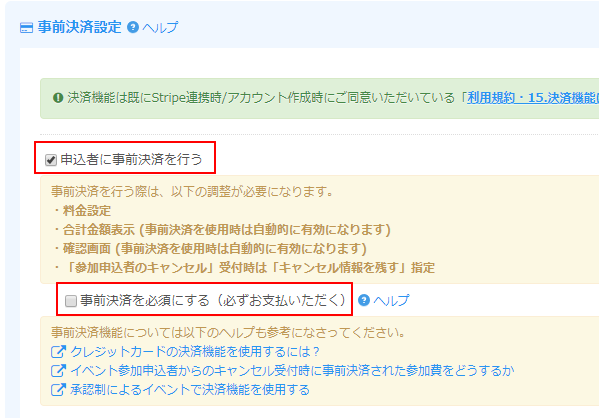 事前決済設定にて「申込者に事前決済を行う」にチェックをいれ、「事前決済を必須にする」は未チェックにして任意と設定します。