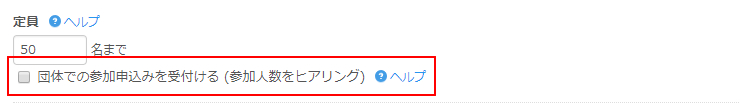 「団体での参加申込みを受付ける」をチェックすると、イベント参加申込み受付フォームで「参加人数」をヒアリングするようになります。