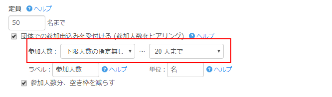 申し込みフォームに設置される参加人数ヒアリングフォームの下限と上限人数を指定します。