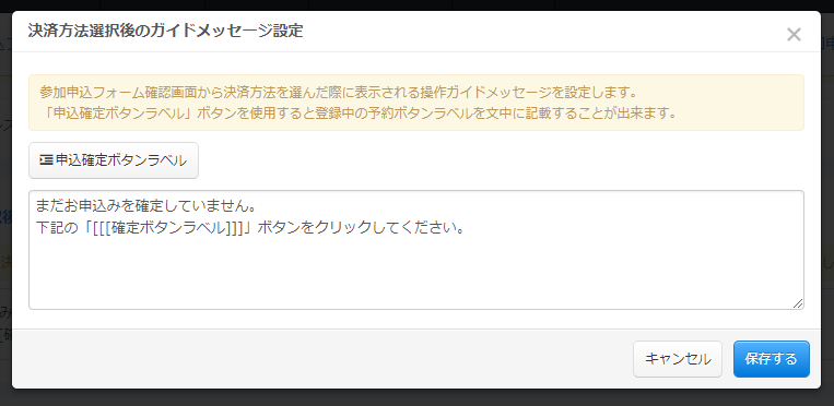 入力欄の上にございます「申込確定ボタンラベル」ボタンは、ガイドメッセージの文中に確定ボタンに登録されたラベルテキストを挿入する機能です。