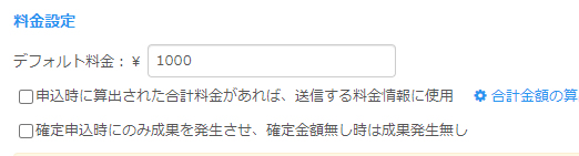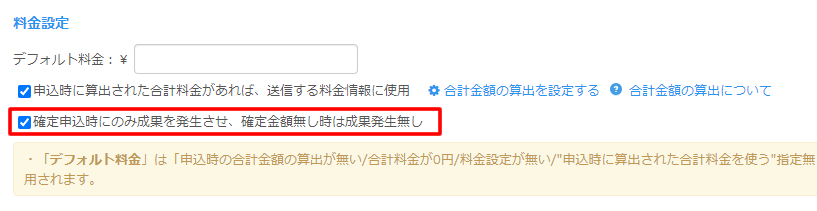 デフォルト料金を指定して、「申込時に算出された合計料金があれば、送信する料金情報に使用」「確定申込時にのみ成果を発生させ、確定金額無し時は成果発生無し」の指定を外しますと、いずれの申込もデフォルト料金で指定されるようになります。