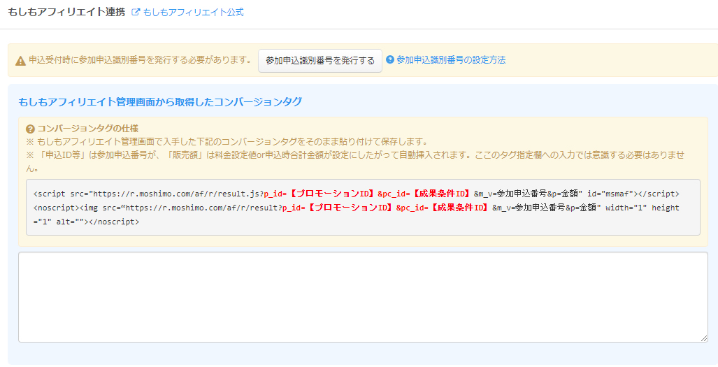 もしもアフィリエイトとの連携に必要となる測定タグはもしもアフィリエイトにお申込みされると入手できます。