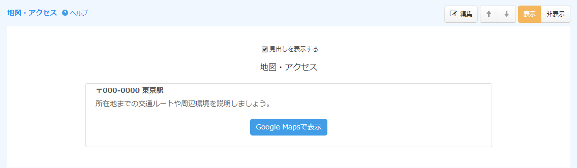 それらのコンテンツのうち「地図・アクセス」項目には、指定した住所のGoogleマップへのリンクボタン設置することが可能です。