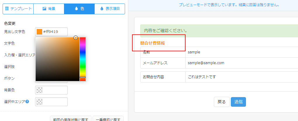 メールフォームの確認画面などで表示される見出しだけの色調整も可能です。