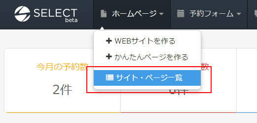 ページ上部ヘッダーより「ホームページ」→「サイト・ページ一覧」をクリックします。