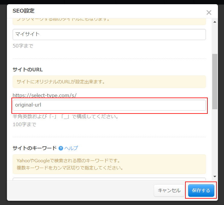 「サイトのURL」設定項目よりオリジナルのURLを入力します。
