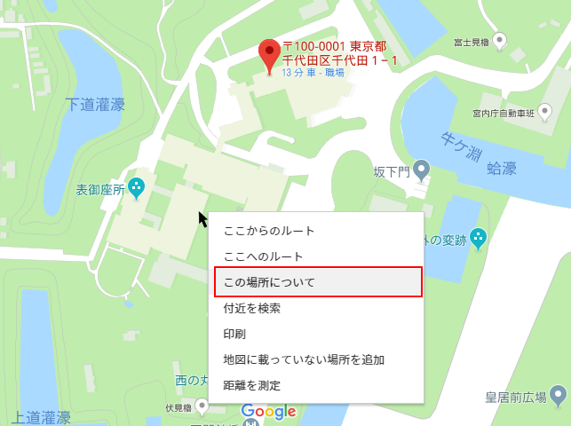 座標を取得したい位置で右クリック⇒「この場所について」をクリックします。