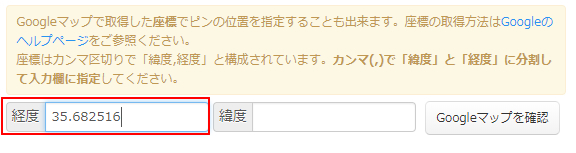 カンマ(,)より左側の数値をコピーして、「経度」入力欄に貼り付けます。