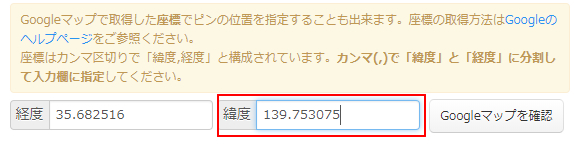 「Googleマップを確認」ボタンをクリックししますと入力した座標位置にピンが移動します。