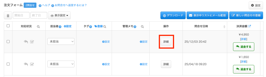 取り消したいクーポンコードを使用した履歴の「詳細」をクリックします。