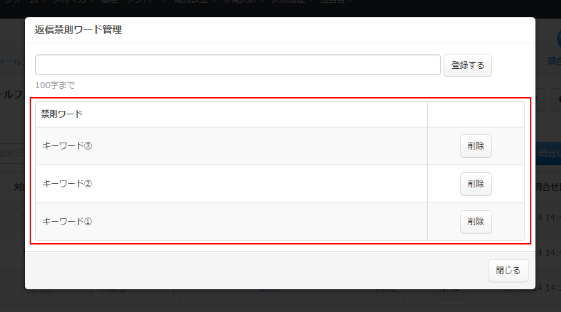 設定された禁則ワードは、返信禁則ワード管理にて登録された禁則ワードを削除することで解除することが出来ます。
