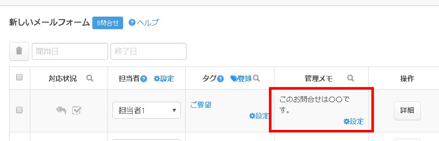管理メモ機能を使用すれば、お問合せごとの付加情報をメモ書きしておくことが可能です。