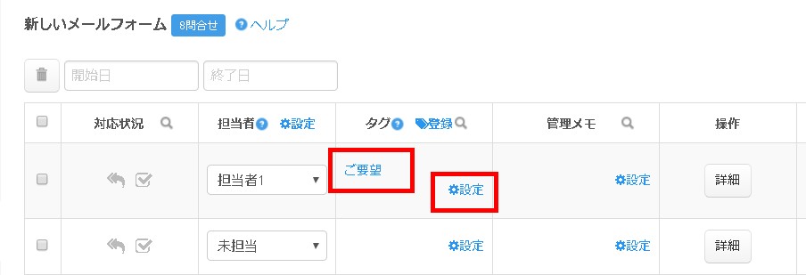 お問合せ情報は管理タグ機能を使用してオリジナルタグで自由に分類管理することが可能です。